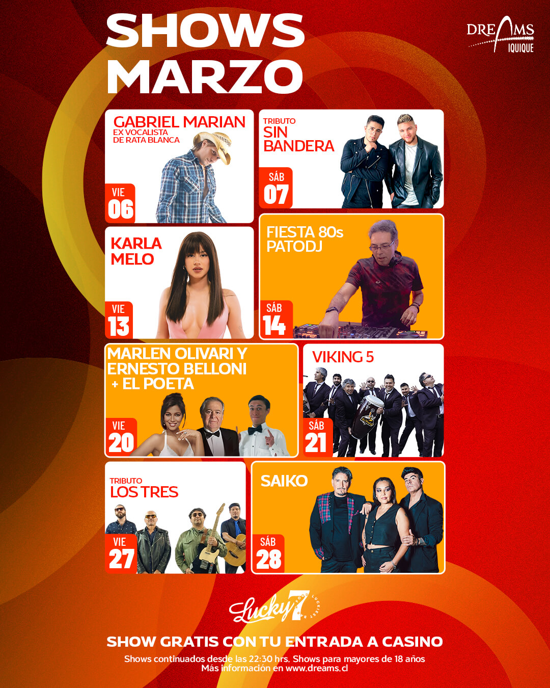 Recuerda seguirnos en Facebook @DreamsIquique y en Instagram @DreamsIquique para estar siempre al día con todos nuestros sorteos, shows y novedades.